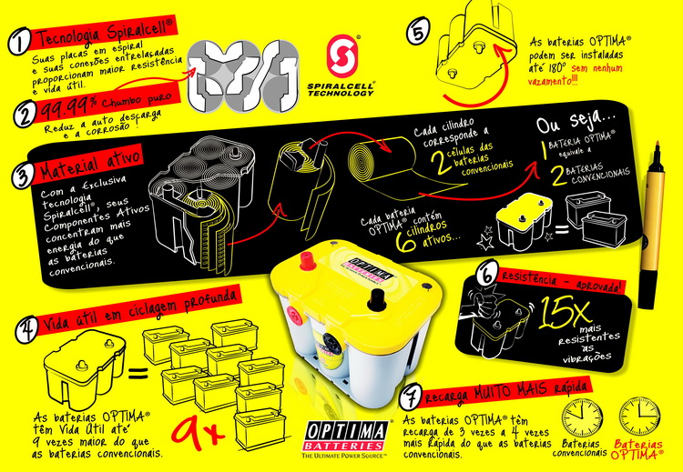 As baterias Optima dão um up na energia do seu carro. As OPTIMA entregam muito mais potência de pico - ideal para quem participa de campeonatos de SPL, e para quem gosta de graves bem definidos. Para quem quer energia para tocar forte por muito mais tempo, as OPTIMA YellowTop são o que tem de melhor. As OPTIMA são perfeitas para quem leva seu som a sério! !